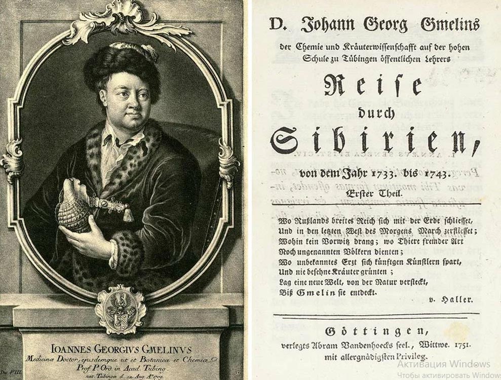 Иоганн Георг Гмелин — немецкий естествоиспытатель на русской службе, ботаник, этнограф, путешественник, исследователь Сибири и Урала, член Петербургской Академии наук. Выполняя функцию натуралиста в академическом отряде Великой Северной экспедиции, за 10 лет он проехал около 34 тысяч километров, положив начало научному исследованию Сибири. По результатам путешествия Гмелин издал 4-томный научный труд «Флора Сибири», а также труд «Путешествие по Сибири» на основе путевого дневника.
