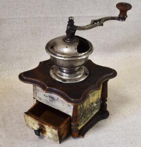 скапливался намолотый кофе; ручки, которая соединялась с подвижным жерновом посредством вертикальной оси, где осуществлялся достаточно быстрый и качественный