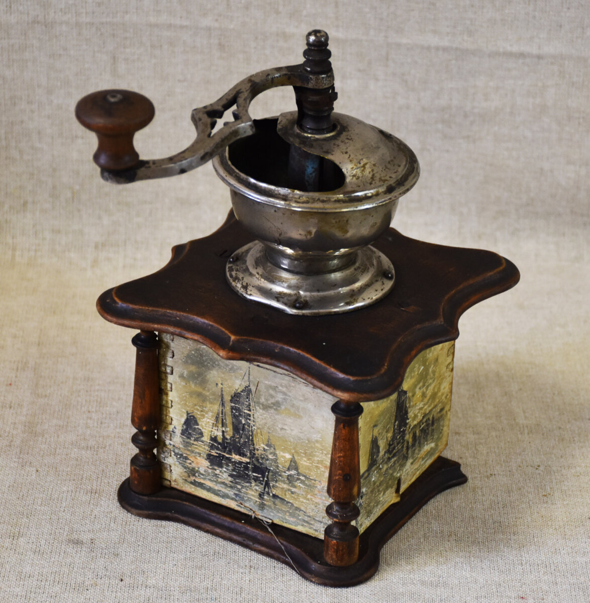 Кофемолка ручная механическая. Состоит из деревянного кубообразного корпуса (четыре стенки расписаны сюжетами на морские темы); выдвижного ящичка снизу, в котором