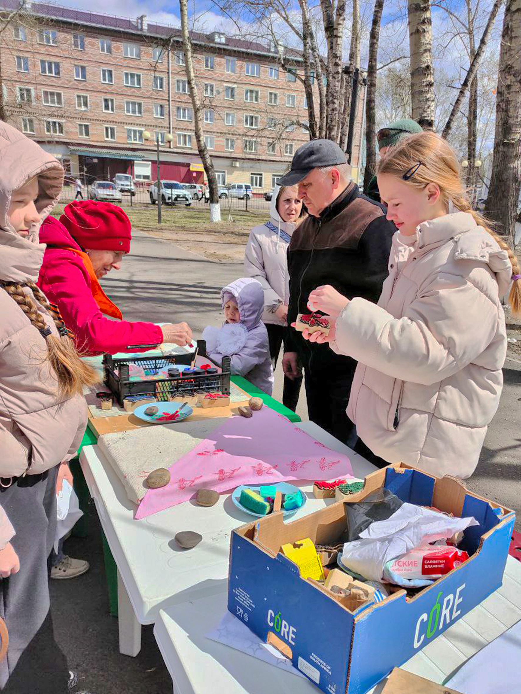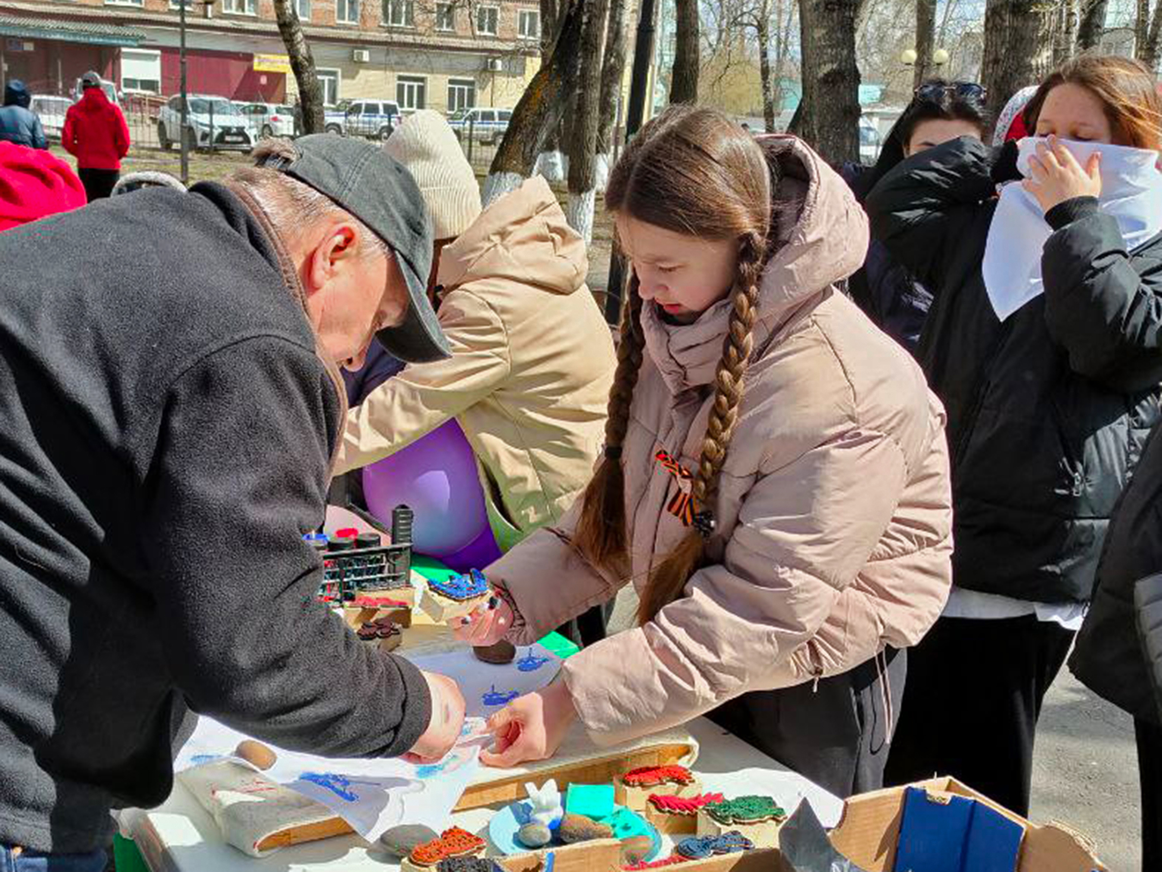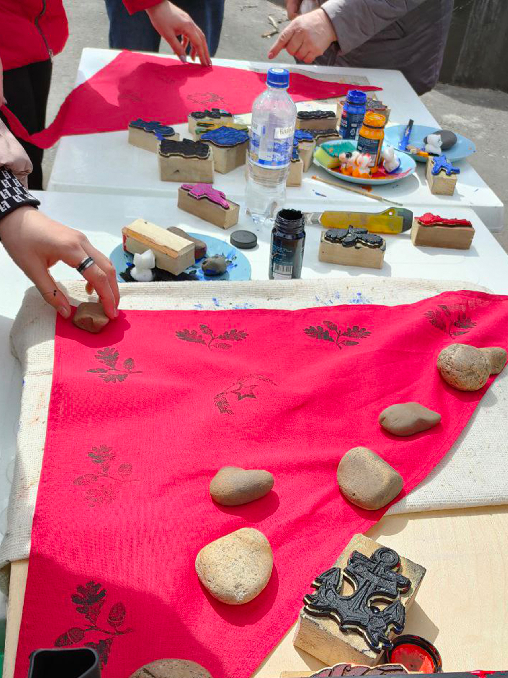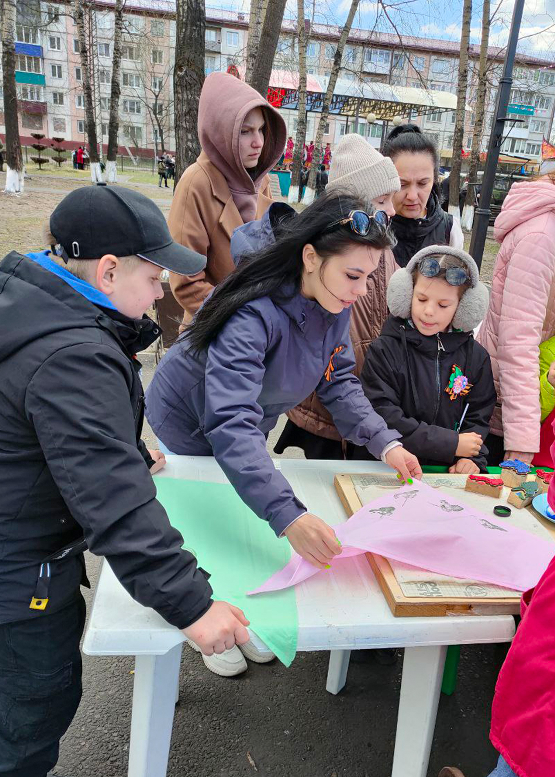 В личном повседневном расписании всегда можно найти немного времени для творчества, тем более, если выдался выходной и для занятия уже все подготовлено. Сотрудники Музейно-культурного центра по традиции 9 мая в день праздничного массового гулянья развернули в городском парке творческую площадку. В этот раз юные нижнеудинцы попробовали свои силы в древнем народном ремесле — набивных рисунков на ткани. Так, когда-то в старину набивали узоры на платки. В нашем случае это были косынки, да и сама тема рисунков соответствовала празднику: все рисунки были связаны с военно-патриотической символикой. Несмотря на то, что пальчики пришлось немного испачкать краской — настроение было у всех хорошее, тем более, что каждый украсил свою «Майскую косынку» на свой вкус.
